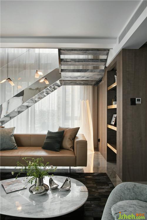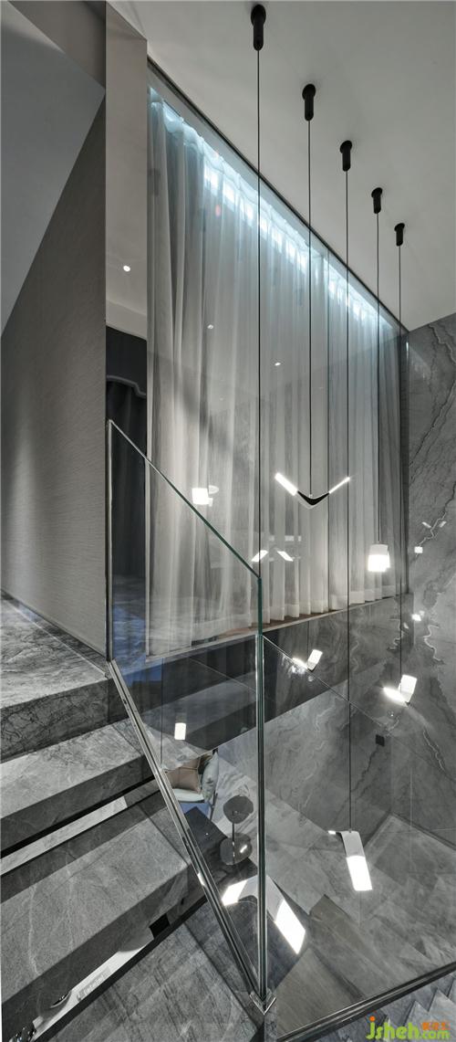 樓梯作為空間的閃光點(diǎn),設(shè)計(jì)師在初期反復(fù)推敲演練,尋覓出這個(gè)寄功能與景觀一體的理想位置,透空的踏步既不影響采光,又輕盈美觀,側(cè)板更是采用整版定制的方式,打造一個(gè)完整的藝術(shù)裝置樓梯。