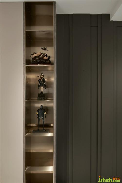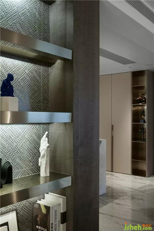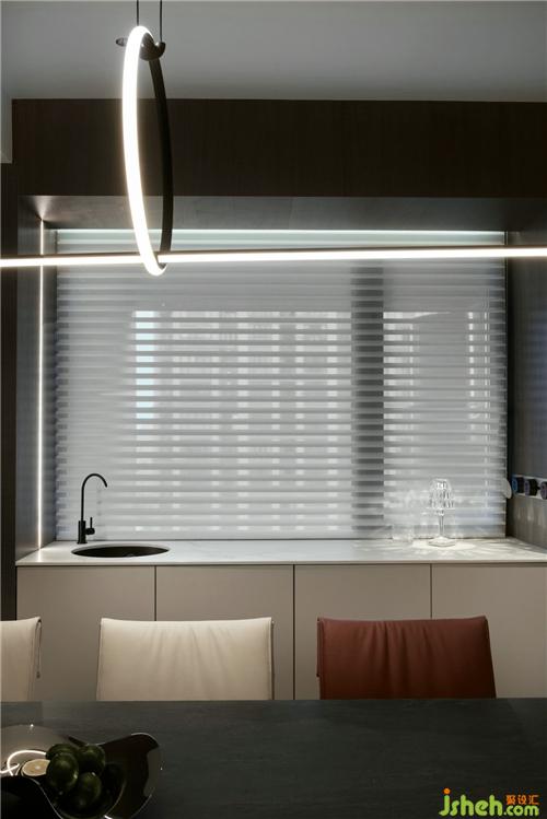 餐桌與島臺一體順延,呈疊級狀起伏,側(cè)面水吧臺的Battery臺燈,光影璀璨,F(xiàn)los個性藝術(shù)吊燈透過形態(tài)順應空間走向,灰色大理石餐桌和ISABEL的皮質(zhì)餐椅更詮釋了空間的精致生活。