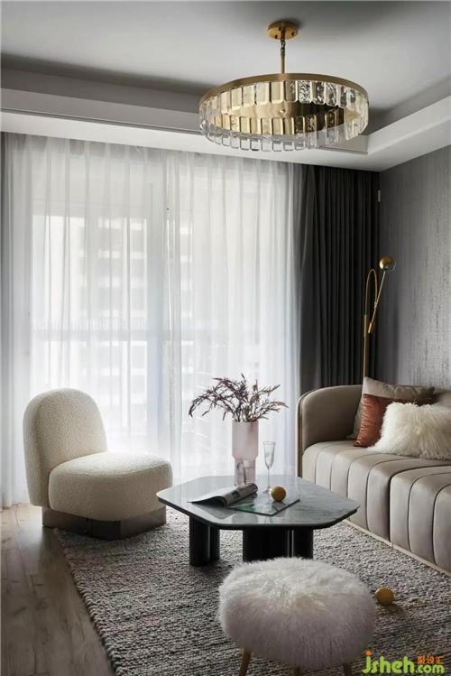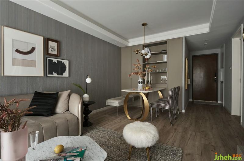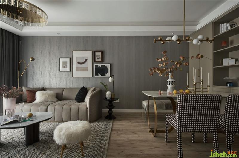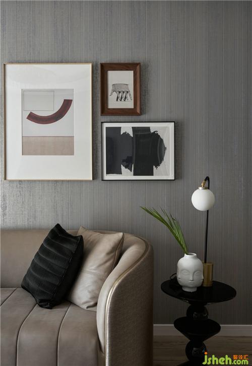 色彩在空間里面起到非常重要的作用,深淺灰的合理使用可大大提高空間視覺感,墻紙的肌理和乳膠漆形成鮮明的對比,奶咖色家具和局部黑色飾品的點綴,豐富了整個空間的層次,金屬質(zhì)感的配飾又增加了時尚輕奢的效果。