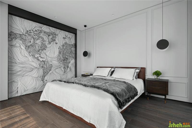 臥室以白色為基調(diào),黑白的床品、卷紋的壁畫,都營(yíng)造了一個(gè)放松休閑、寧靜舒適的休憩空間,而落地玻璃窗將視覺延伸出去,隨即可觀賞窗外美景。