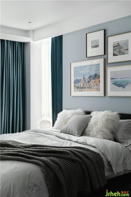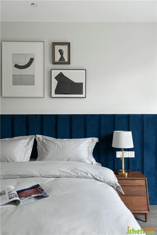 次臥純色的墻面配上湖藍(lán)色的床靠背,營(yíng)造了一個(gè)寧謐自然的氛圍,簡(jiǎn)約的組合掛畫,使整個(gè)空間的設(shè)計(jì)感頓時(shí)提升,成為臥室里的點(diǎn)睛之筆。