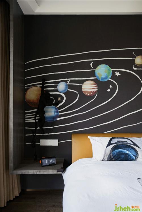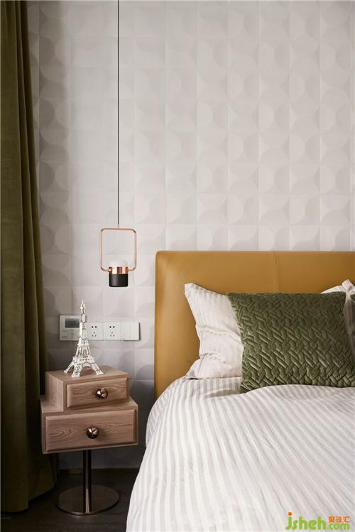 有立體肌理的白色墻紙搭配不規(guī)則床頭柜使得整個次臥充滿活力。