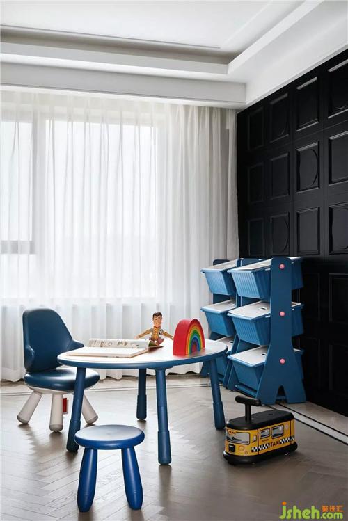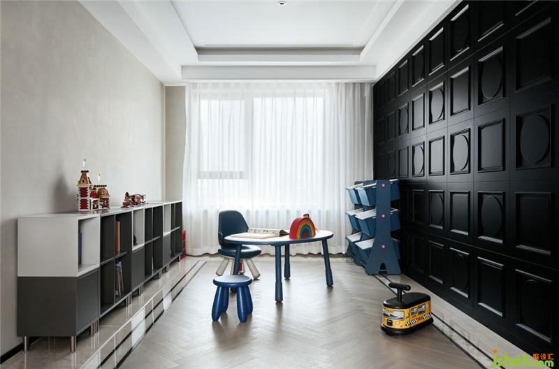兒童房外側使用了專門定制的黑色護墻,一方面增加了空間的層次和質(zhì)感,另一方面是要與入戶玄關鞋柜后墻,兩面整合在一起上海室內(nèi)設計師。