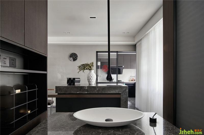 餐廳的點(diǎn)睛之筆便是這個(gè)與洗手臺(tái)連接的這個(gè)地方,客衛(wèi)的空間很局限,設(shè)計(jì)師則把洗手臺(tái)移到外面,增加了空間的利用率,力設(shè)計(jì)選用的水波紋不銹鋼以及具有藝術(shù)感的龍頭,讓這個(gè)空間更有藝術(shù)氣息。
