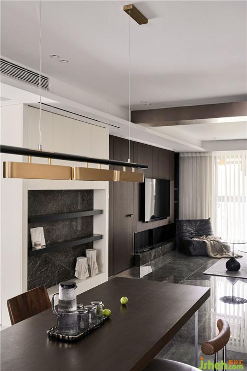 原始結(jié)構(gòu)中餐廳被兩面墻體包圍,使得整個(gè)餐廳氛圍很壓抑,加上原始戶型有一根承重柱,設(shè)計(jì)師把墻體打開,并且就著承重柱做了一個(gè)餐廳的儲(chǔ)物柜,利用實(shí)木格柵進(jìn)行飾面;島臺(tái)加上餐桌做了一個(gè)整體的設(shè)計(jì),餐桌的實(shí)木與背后的木格柵相互呼應(yīng);