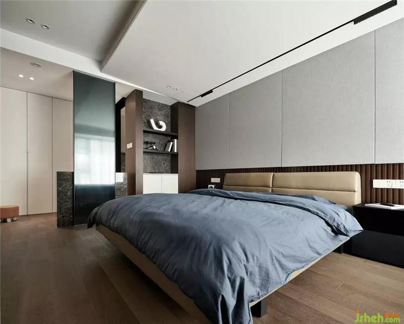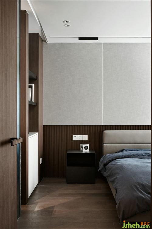 因?yàn)樵冀Y(jié)構(gòu)中主臥空間有限,設(shè)計(jì)師把主臥與玄關(guān)部分敲掉增加了儲(chǔ)物空間,同時(shí)也增加衛(wèi)生間的空間,把洗手臺(tái)干區(qū)部分移到外面來,使用長虹玻璃作為隔斷;主臥吊頂設(shè)計(jì)成斜面主要是為了避開頂梁位置,給中央空調(diào)留出擺放空間,同時(shí)考慮吊頂?shù)拿烙^。