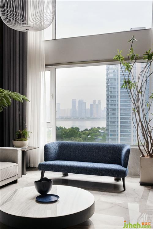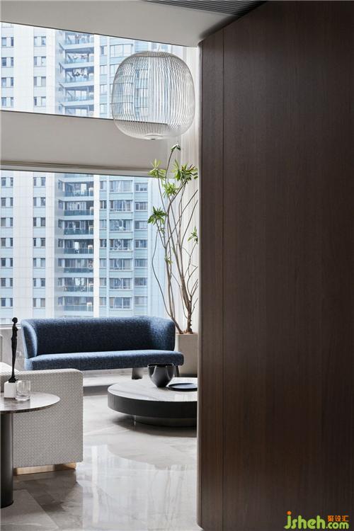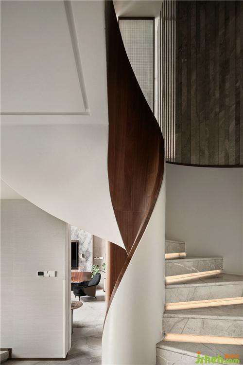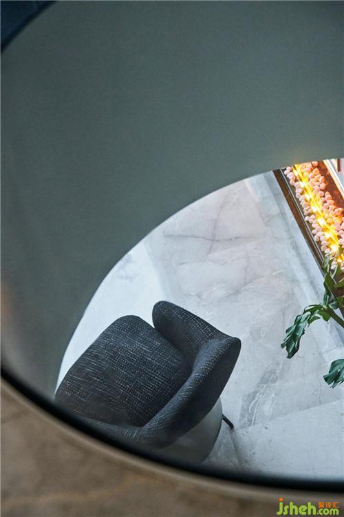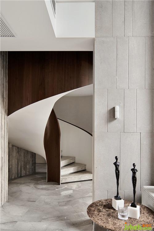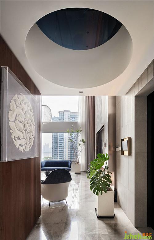 最使人驚艷的是玄關(guān)設(shè)計。推門進(jìn)來,映入眼簾的是一面用木飾面打造的精致隔斷,頂上天井設(shè)計,鏤空到二樓家庭廳位置,杭州豪宅設(shè)計完美解決了玄關(guān)光線較暗的問題。破口沖天,似有想突破拼出一翻天地,天井,不止是一方美景,更是一方哲學(xué)。