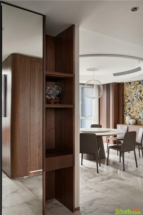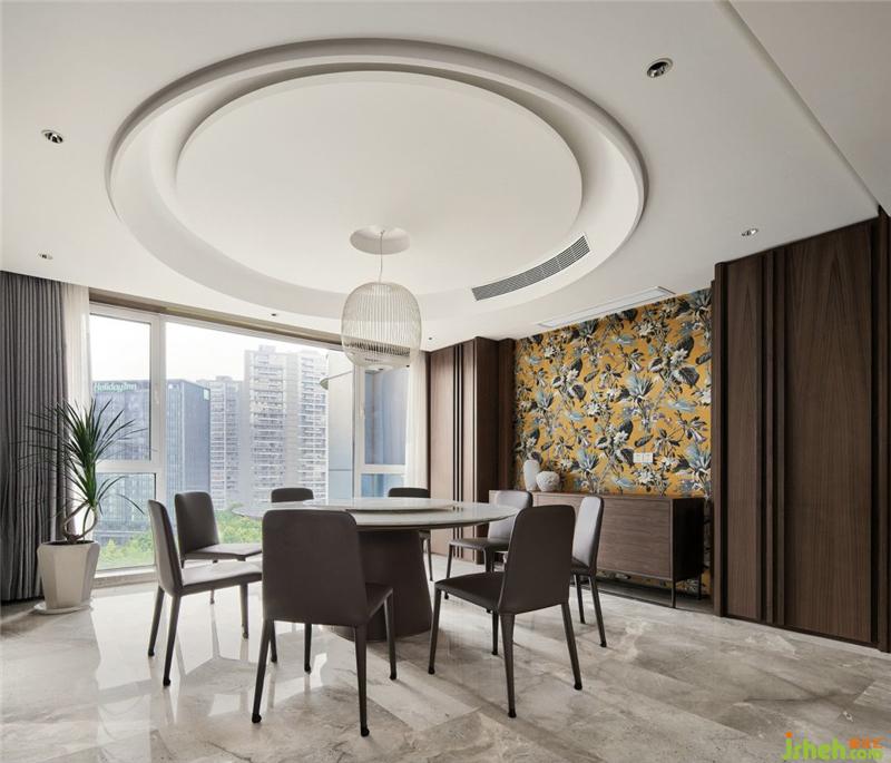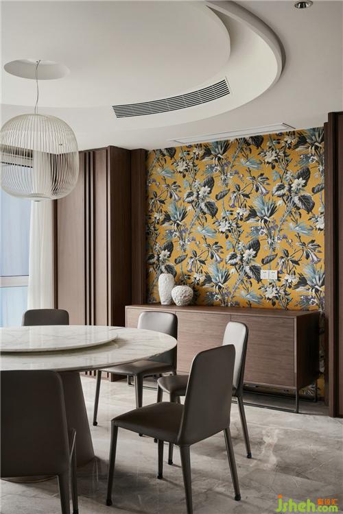 餐廳異形吊頂設(shè)計(jì)非??简?yàn)施工工藝,頂部圓形造型的加入,表現(xiàn)出空間獨(dú)特的藝術(shù)美感,在流暢線條的回旋間營造出一種奢華的氛圍,邊柜后使用了一個(gè)鮮艷的金黃色外加花叢的墻紙,墻紙表面的凹凸質(zhì)感也給整個(gè)餐廳增加了許多華麗富貴的氣息。
