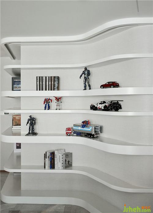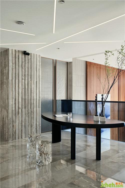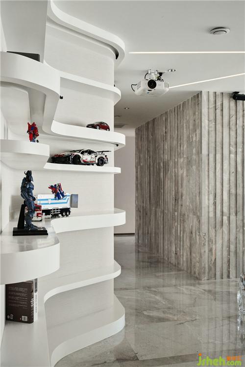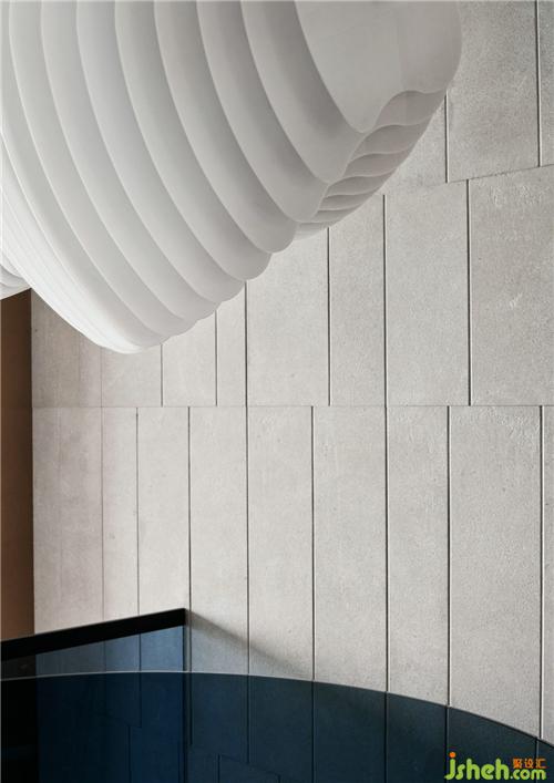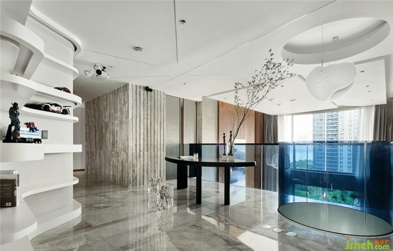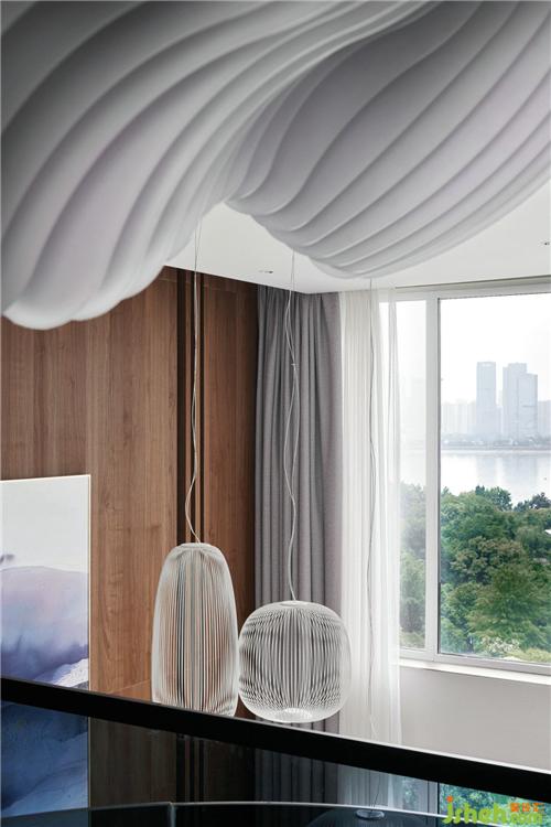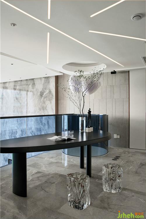 二樓家庭廳在天井位置增加了藍(lán)色玻璃,圓形吊頂與天井大小相同,加上不規(guī)則吊燈,光束映照到一樓玄關(guān)位置,仿佛是一件藝術(shù)裝置;藝術(shù)是對一件事、一個(gè)物品乃至一個(gè)念想賦予外界的認(rèn)知和自我認(rèn)知融合在一起產(chǎn)生的精神祈求。