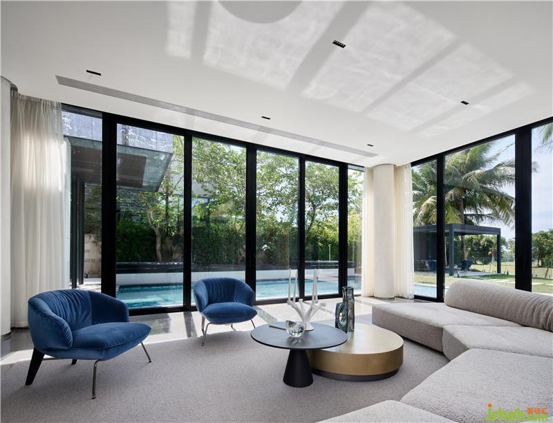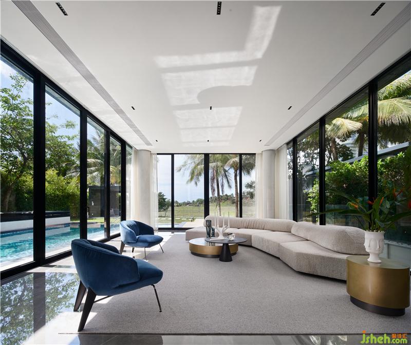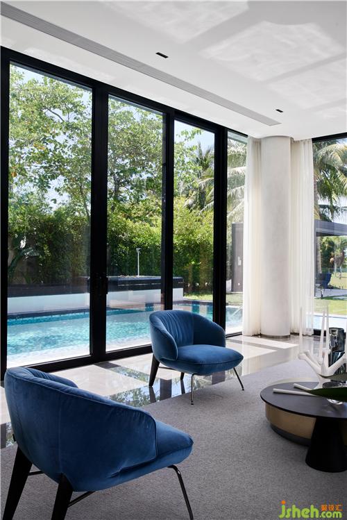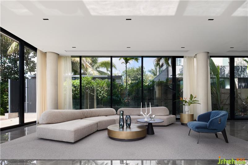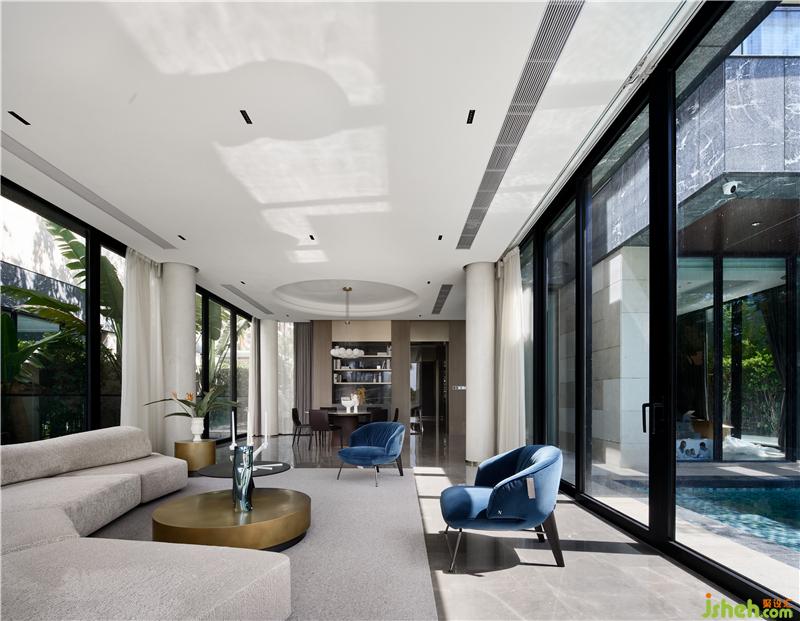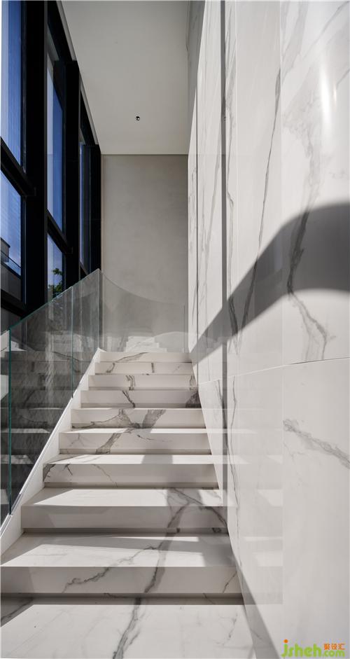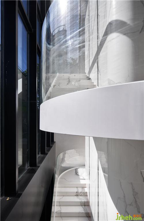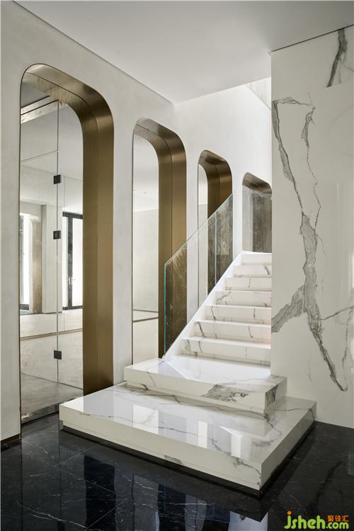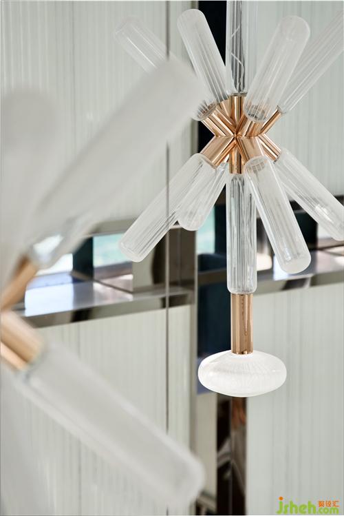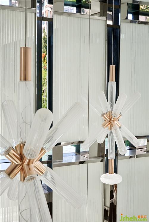 與以往的封閉式玄關(guān)不同,設(shè)計(jì)師利用鏡面金屬與鏤空設(shè)計(jì),結(jié)合超高挑空,打造出一個(gè)光與影錯(cuò)綜復(fù)雜的空間。設(shè)計(jì)圓弧型吊頂搭配星光式的吊燈,當(dāng)早晨陽(yáng)光照進(jìn)玄關(guān),甚至一番美景。