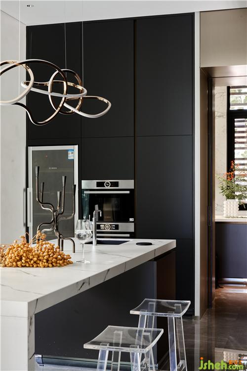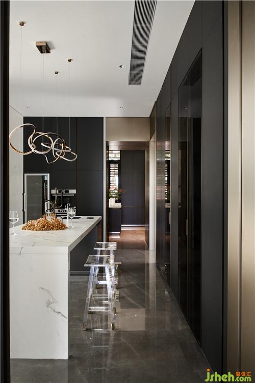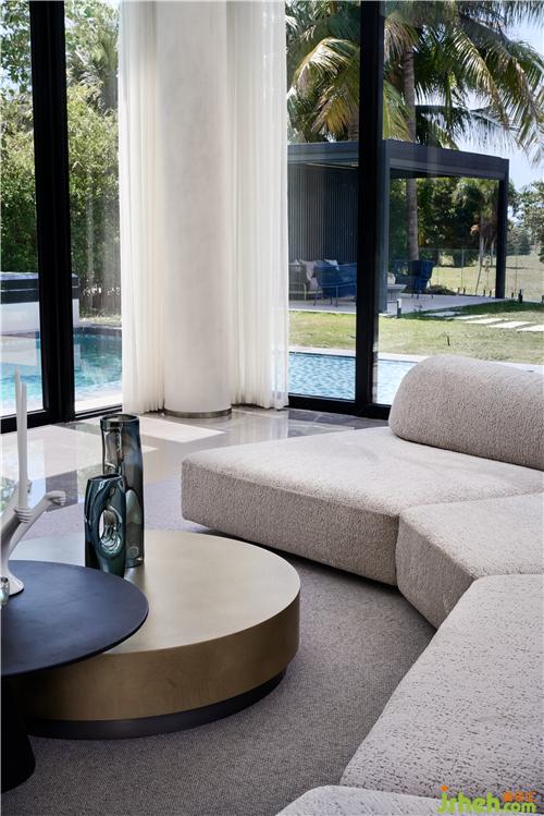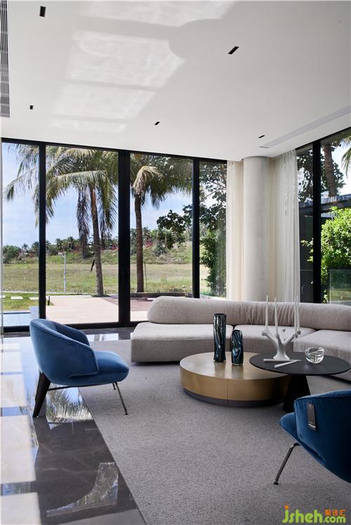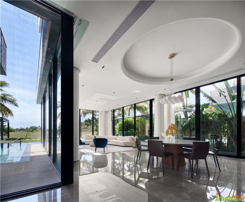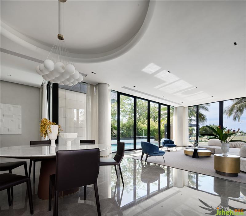 設(shè)計(jì)的意義不在意事物,而在于氛圍和感官。落地窗外有泳池、花草樹(shù)木藍(lán)天,三亞別墅裝飾客餐廳剛好利用這天然美景,室內(nèi)不添加冗余的設(shè)計(jì),走既簡(jiǎn)單又高級(jí)路線,設(shè)計(jì)線條十分流暢。