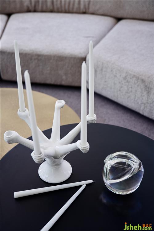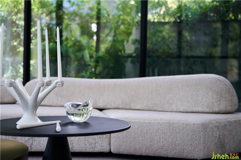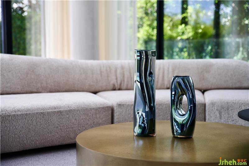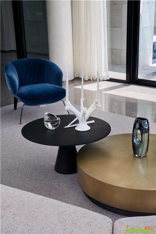 軟裝搭配需要?jiǎng)e出一致,不超過(guò)自然美景但同時(shí)也要與之配合。藍(lán)色單人沙發(fā)與窗外的藍(lán)天池水對(duì)應(yīng),作為空間跳色不單調(diào)且高級(jí),茶幾金屬質(zhì)感,沙發(fā)布藝質(zhì)感、擺件玻璃質(zhì)感等共同組合,為這一個(gè)空間的增添亮點(diǎn)。