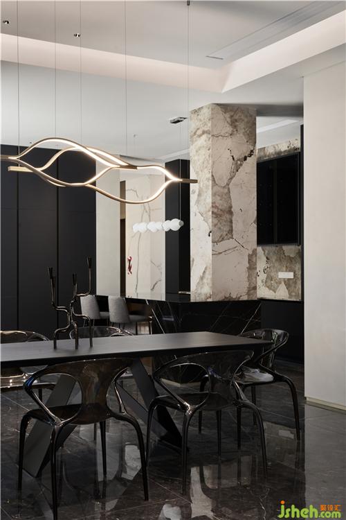 地下室打造一個娛樂空間,使用涂料制作背景墻,可增加投影作為影音室的空間;吧臺利用了長虹玻璃的凹凸質感與銀狐巖板營造出一個奢華美觀的氛圍;餐桌旁增添一幅抽象但華麗的跳色畫,給整個空間帶來了不一樣的感覺。
