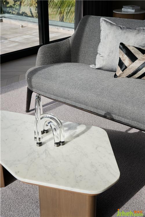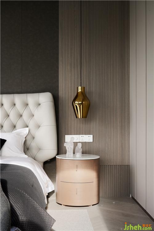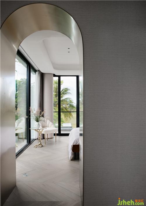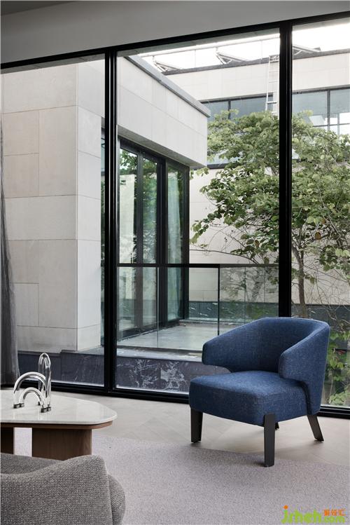 二樓主臥與樓下客餐廳一樣,擁有自然的美景,落地窗必不可少,藍色單人沙發(fā)與餐廳單人沙發(fā)顏色相互呼應(yīng),加上黑白灰高級的搭配,呈現(xiàn)出簡約且高級的空間。