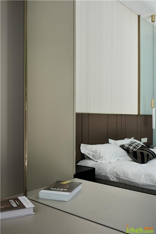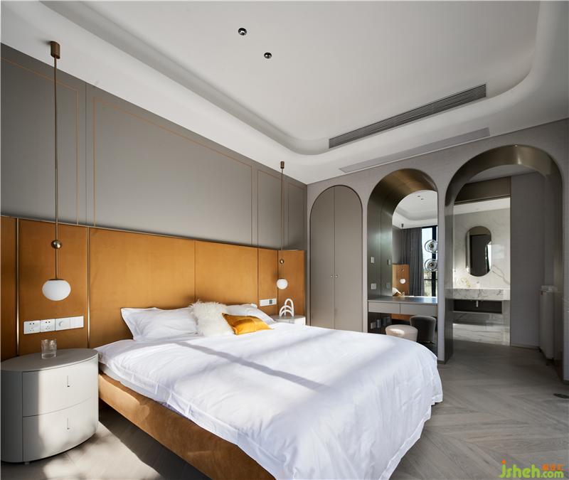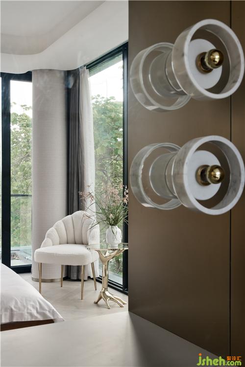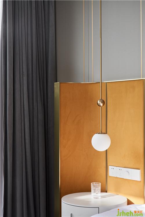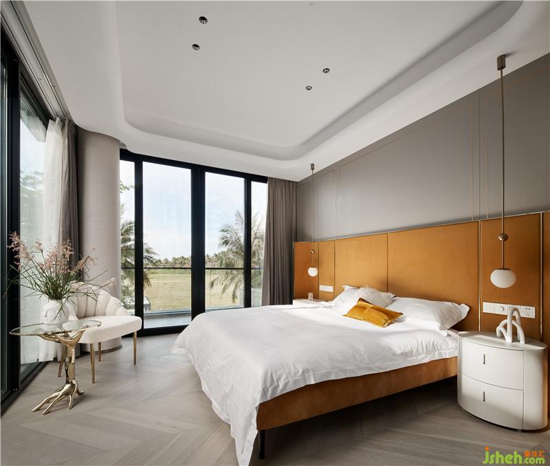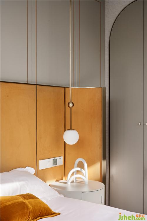 次臥主要打造一個(gè)相對活力的臥室,所以使用鮮艷的橙色作為主色調(diào),現(xiàn)場制作的硬包與床架選用同一布藝材質(zhì),金屬作為點(diǎn)綴;單人沙發(fā)散發(fā)著優(yōu)雅華貴的氣息,邊幾非常有特色,是兩只手掌組合的形狀。