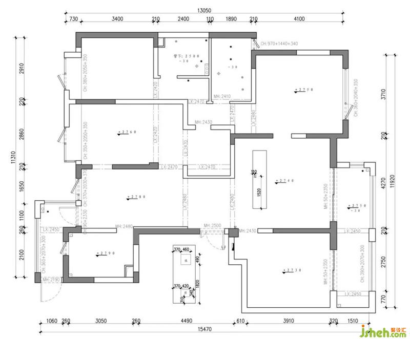 原始結(jié)構(gòu)空間動線比較凌亂,浪費(fèi)面積比較多,入戶的玄關(guān)設(shè)置也會有點局促,不是滿足三代人同住的理想空間。