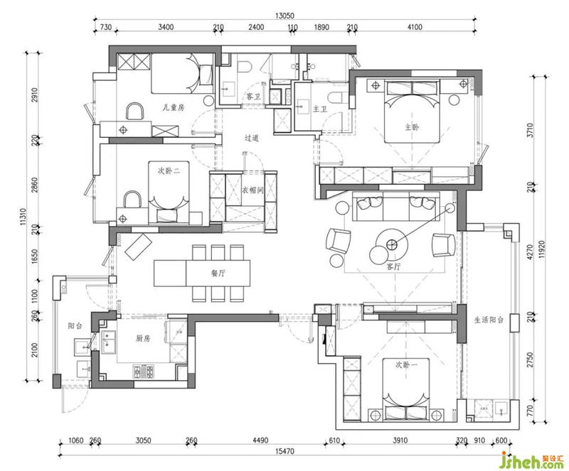 關(guān)于規(guī)劃:設(shè)計師在一番拆改之后,客餐廳視覺空間擴(kuò)大,并且變得整齊開敞,可以滿足孩子們在室內(nèi)奔走玩鬧;休息區(qū)過道調(diào)整之后,杭州裝修設(shè)計去往各個房間的動線也清晰起來,互不干擾;共用衣帽間大大增加了家庭的儲物功能,同時衣帽間位置的調(diào)整,使入戶也變得通透爽朗。