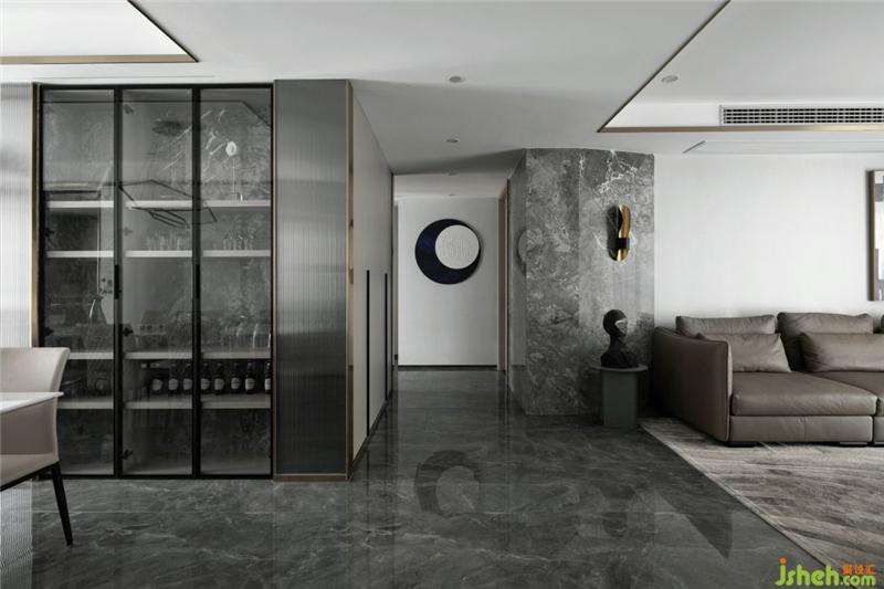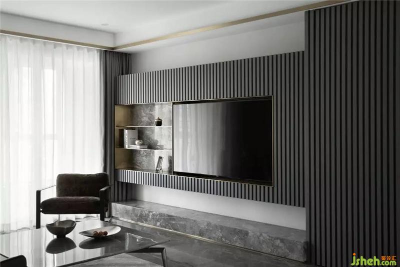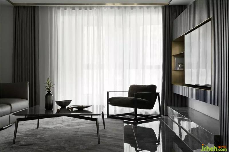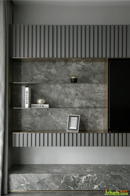 全空間以灰白色調(diào)為主,電視墻隱形柜門的格柵線條,滿足功能同時豐富了空間的層次感;沙發(fā)背后灰紋路的大理石裝飾和金屬板的運(yùn)用,杭州裝修設(shè)計營造出一種有機(jī)的現(xiàn)代奢華感,用線條勾勒出一個干凈簡單的畫面。