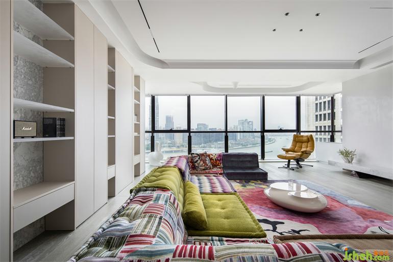 透明亞克力隔板的使用讓背景墻面的書柜更加輕盈與開放。上海豪宅設(shè)計交流、閱讀、影音與觀景功能在這里實現(xiàn)集合。