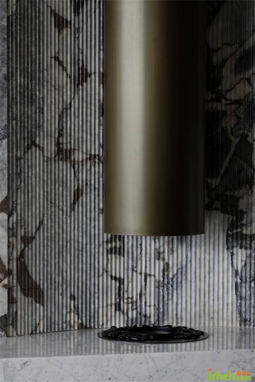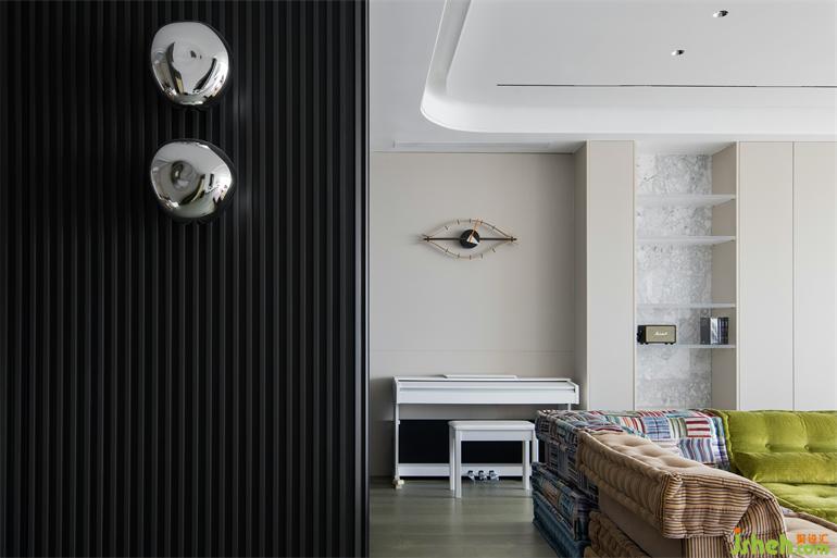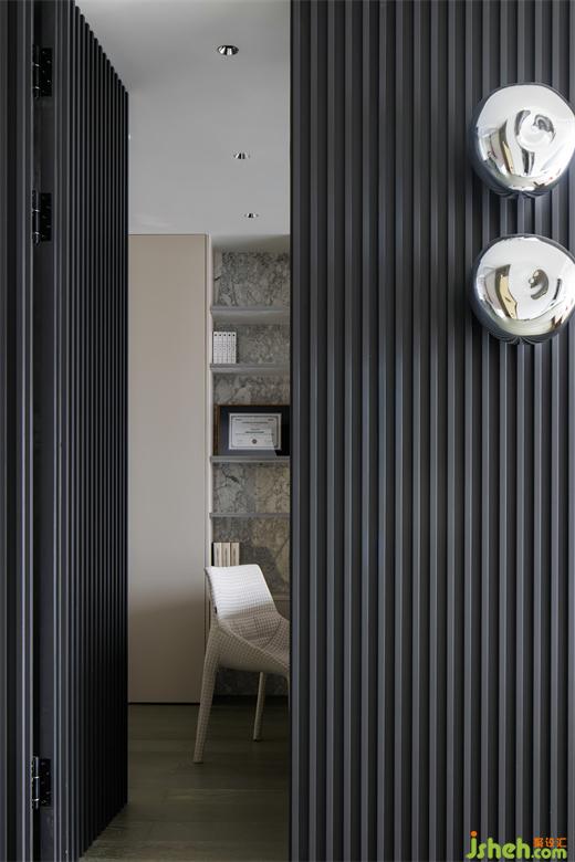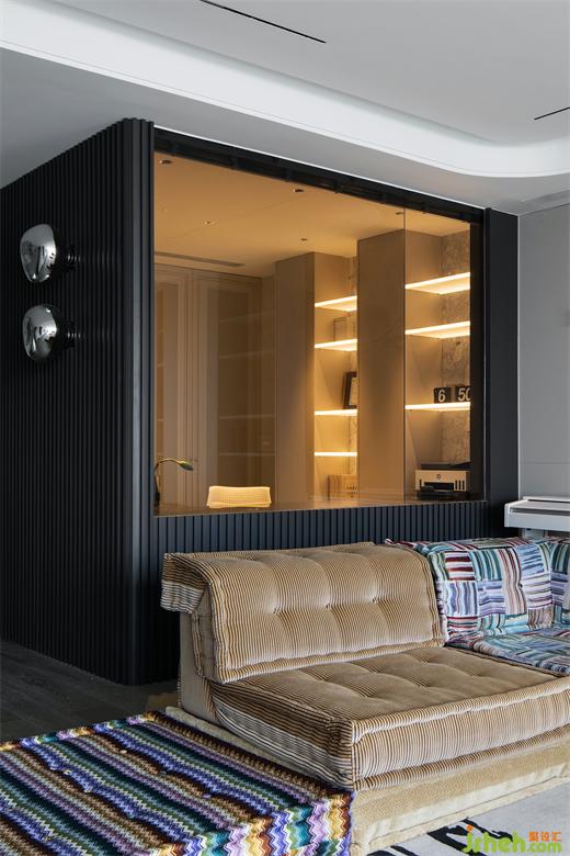黑色的木質(zhì)格柵板顯示著區(qū)域的獨立性。上海豪宅設(shè)計沙發(fā)區(qū)域面的灰色玻璃又保證了觀景與家人之間默契交流的需求。