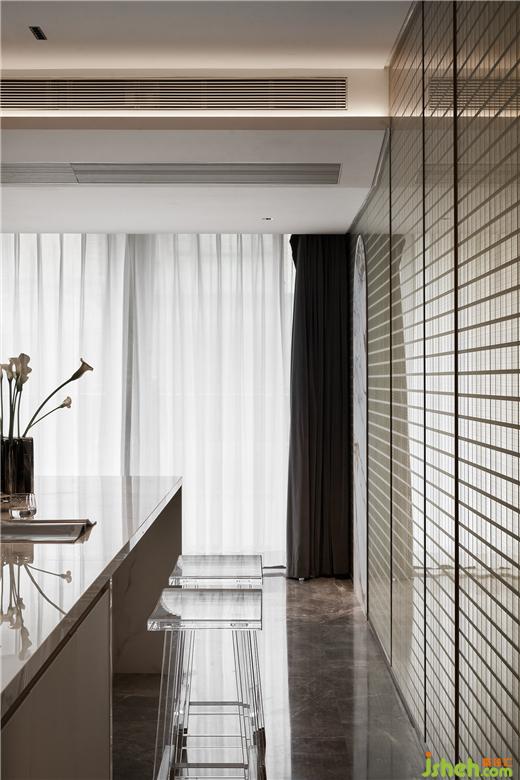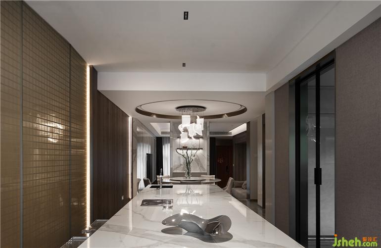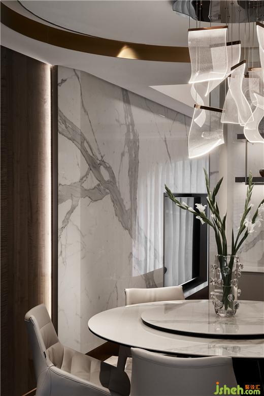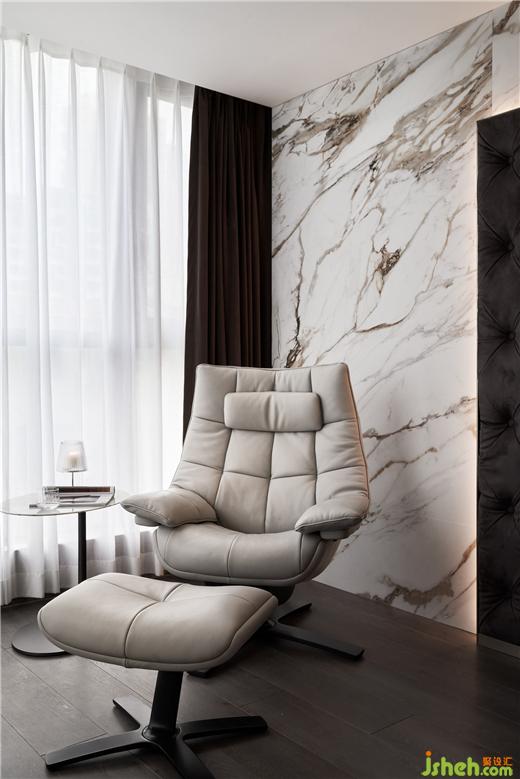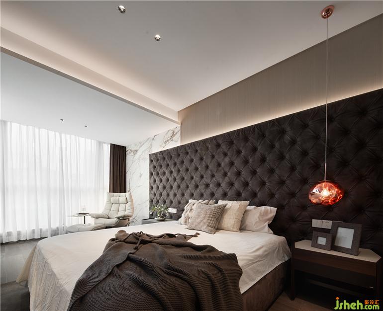 無(wú)主燈設(shè)計(jì)已然成為現(xiàn)代居所營(yíng)造氛圍感的首選,別墅設(shè)計(jì)造型背景及天花四周的隱藏?zé)魩渡涓訉庫(kù)o閑適的休憩氛圍。床頭軟包、墻體與大理石分層落錯(cuò),層次分明而相互呼應(yīng),空間立體感油然而生。