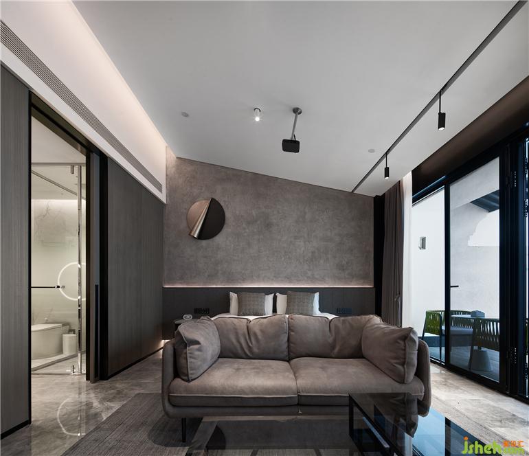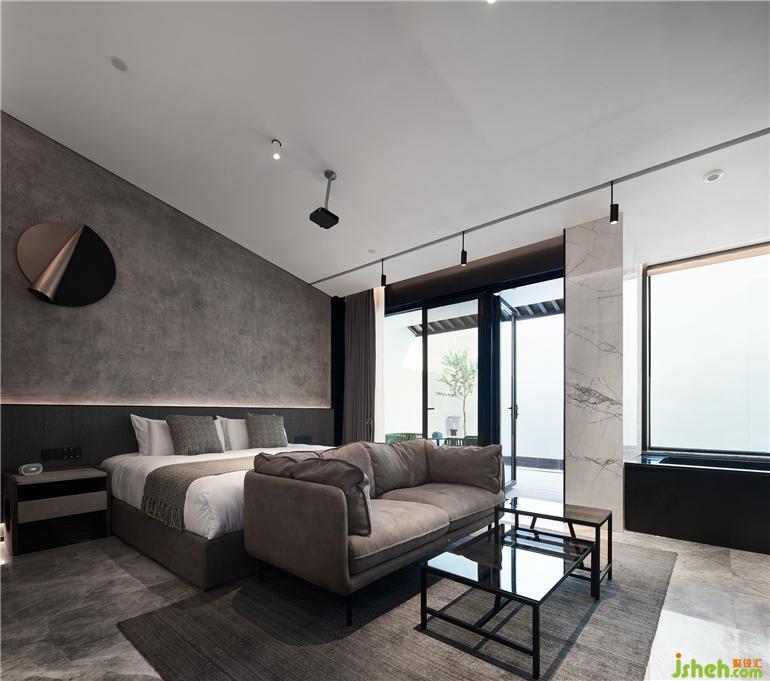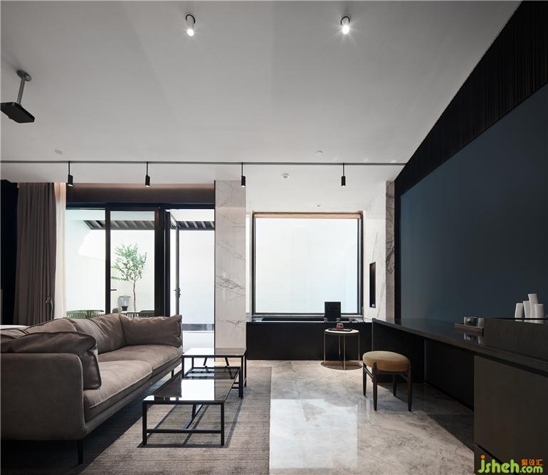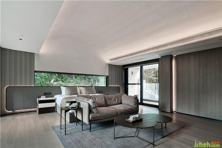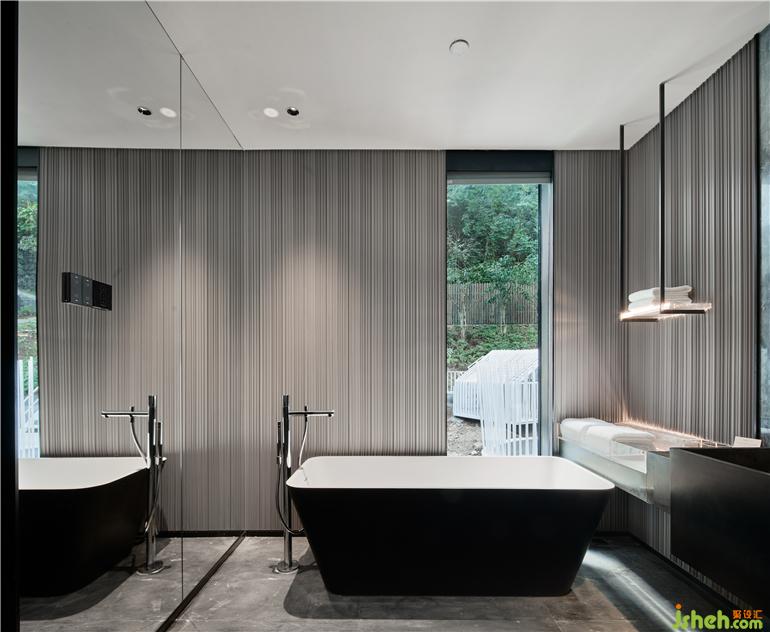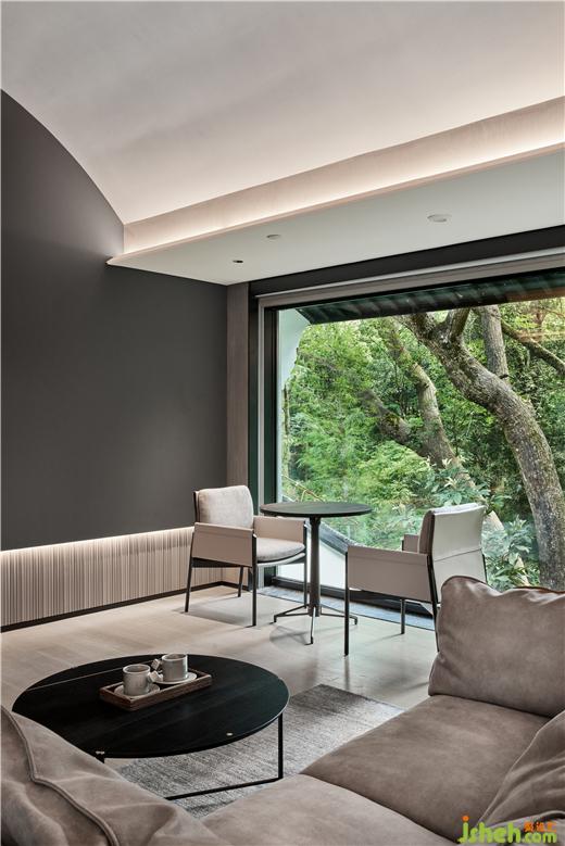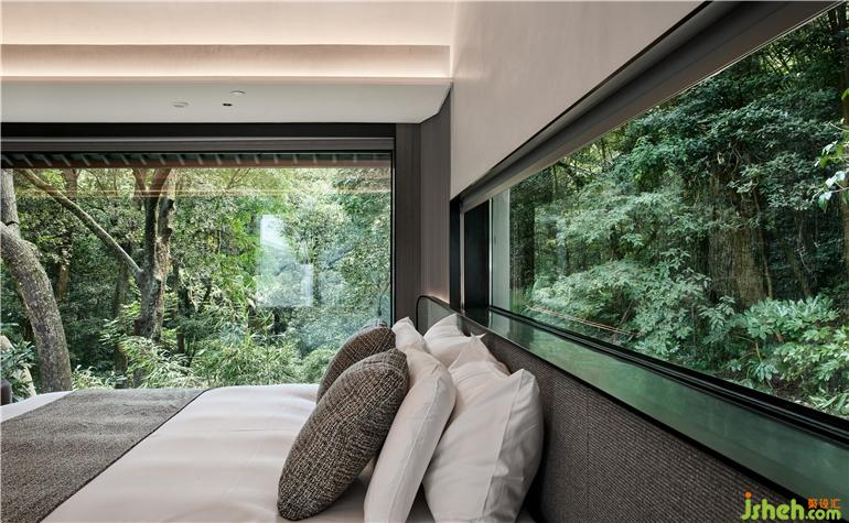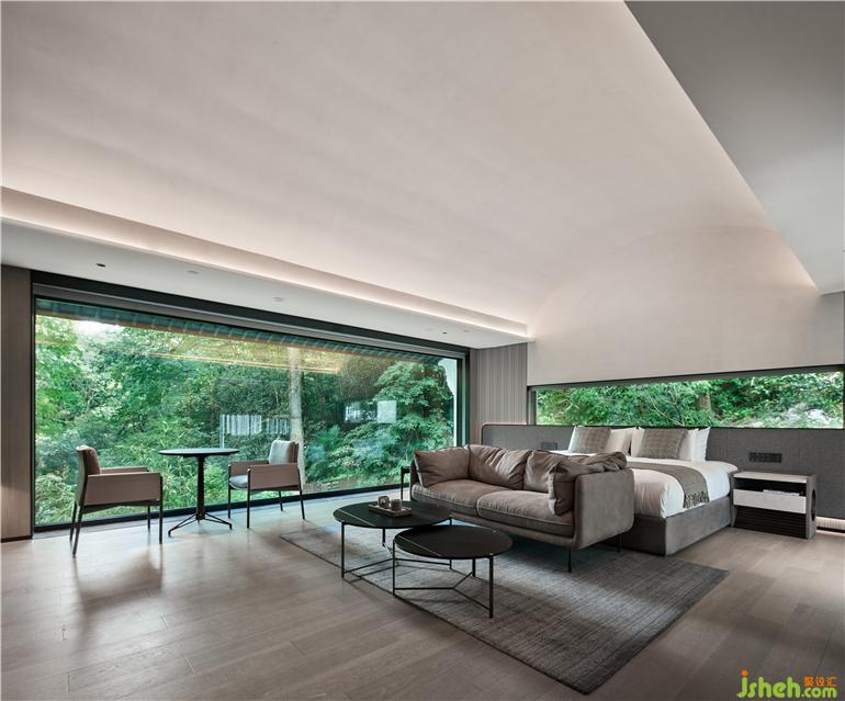 杭州度假酒店設(shè)計(jì)兩面通透的落地玻璃窗,把山林綠意帶來眼前。