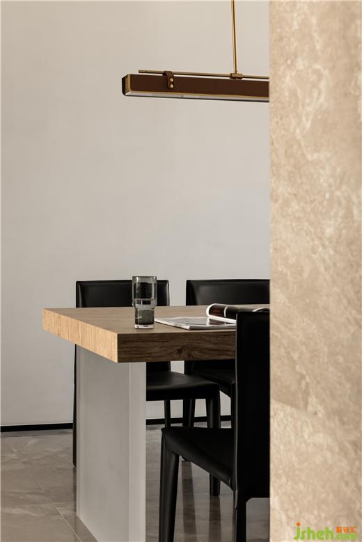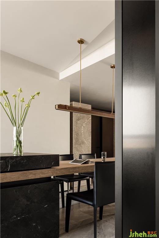 功能上,中餐廚房+西餐島臺的設(shè)計平衡居住年齡差異與飲食多樣化的的差異。而形式上的疊級、嵌入、解構(gòu)又為平凡的生活建立優(yōu)美的秩序與幾何美感。