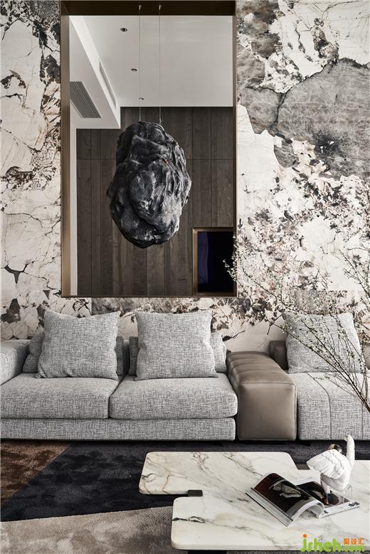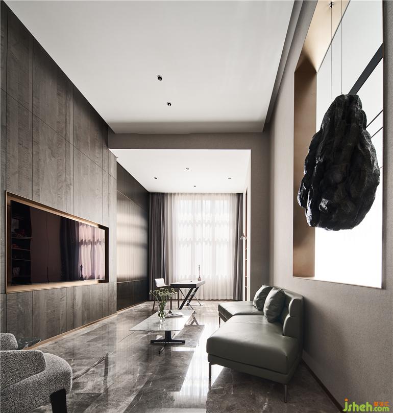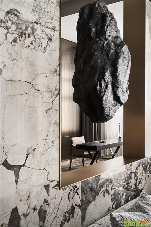 來自潘多拉的奢石色彩將共享、開放的客廳與相對隱秘的工作區(qū)隔開,背景墻面的“開窗”又使得空間彼此聯(lián)系。