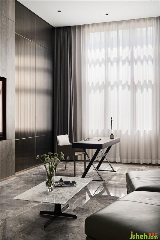 這種類似“取景”的手法創(chuàng)造出可對話交流的視線,呼應(yīng)的金屬“畫框”則成為了引導(dǎo)視線的線索?!吧绞睉业踉诋嬁蛑虚g,杭州綠野春天別墅裝飾設(shè)計形成一部分的視覺遮擋,讓窗開出更大氣,也更親人的尺度。