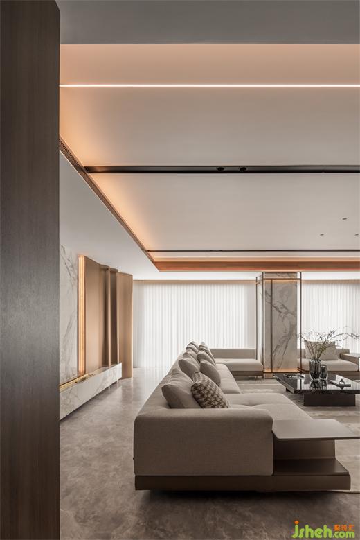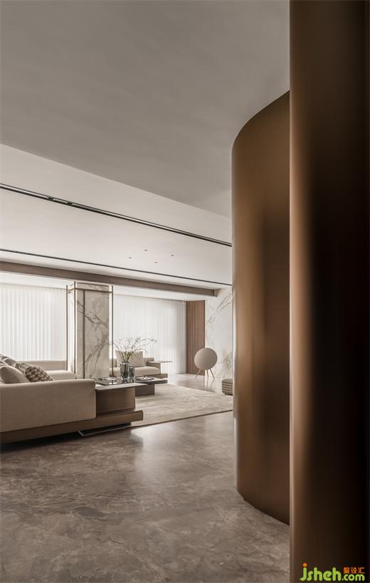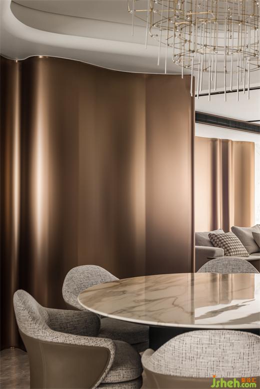▼ “金屬波浪”的視覺(jué)引導(dǎo),從玄關(guān)看客廳