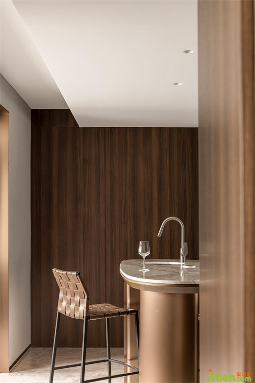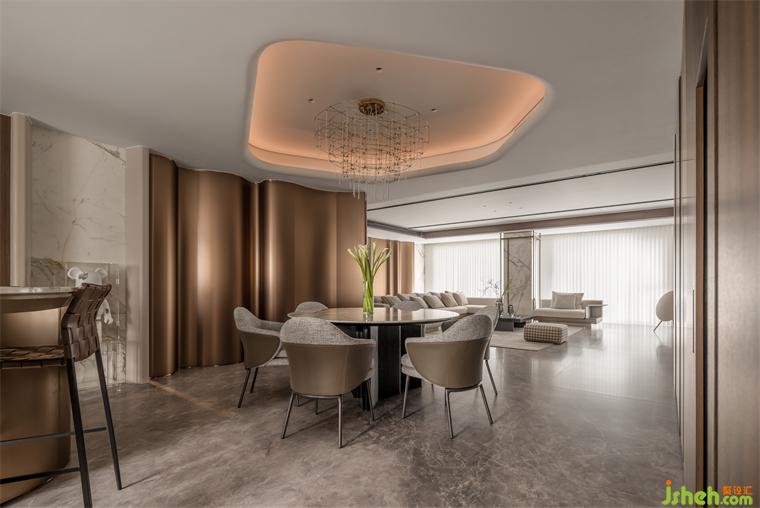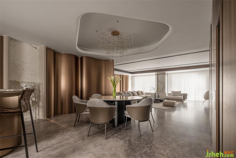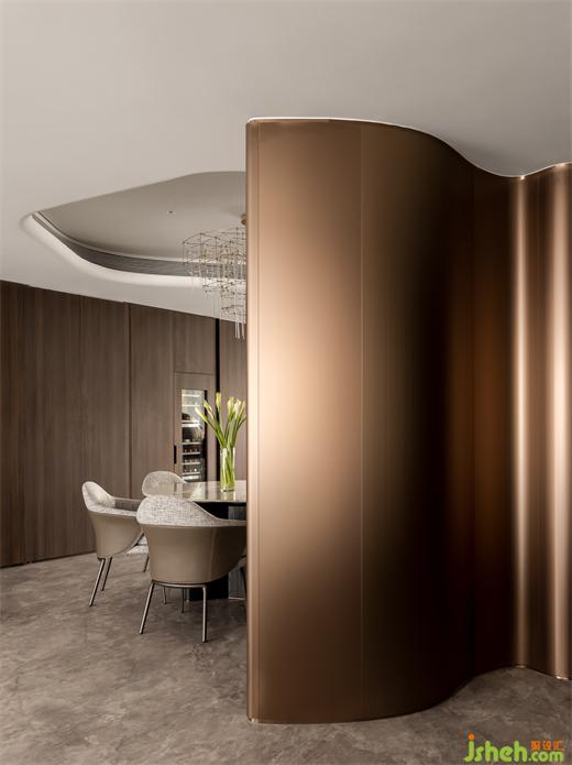 象征完滿的“圓“與“弧”充分運(yùn)用在玄關(guān)背后的餐廳結(jié)構(gòu)。被統(tǒng)一木飾面隱藏的蝴蝶門承接了大量的餐邊收納,杭州大平層裝修設(shè)計(jì)師還細(xì)心地將無(wú)框新風(fēng)口藏進(jìn)了頂部的異形吊頂,沒(méi)有棱角的共聚空間讓家人更多的交融在一起。