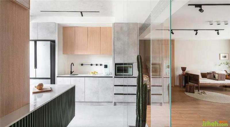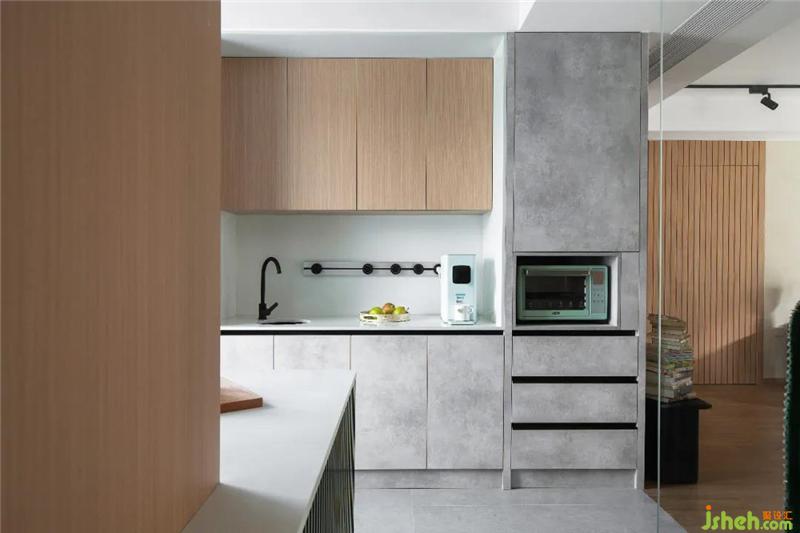 中西廚采用中島“回”字形動線設(shè)計,讓彼此更好的連接在了一起。莫蘭迪綠、白色與原木色木作的組合點亮空間,融合平織地毯,不多不少,恰到好處,整個空間流露出自然與原始之美,仿佛置身于自然的懷抱。