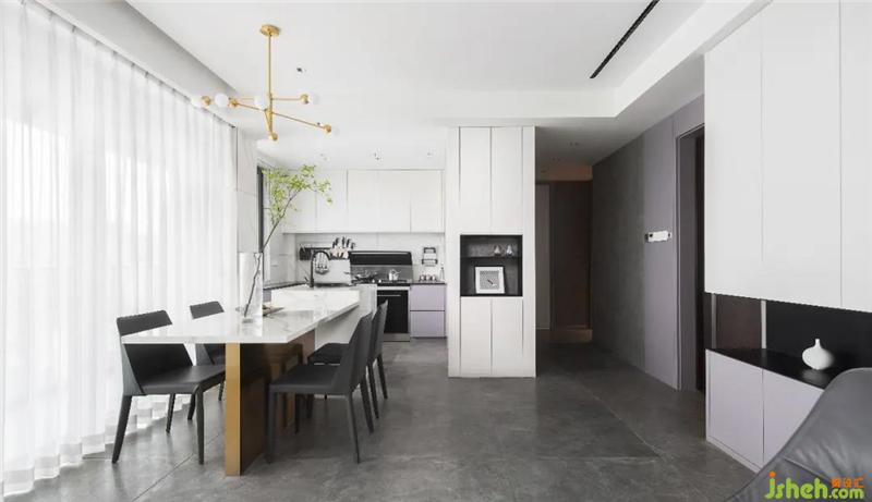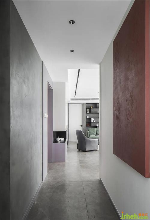 公共區(qū)域灰紫與灰白搭配經(jīng)典又現(xiàn)代,黃銅、啞光黑五金等都能呈現(xiàn)出驚人的質(zhì)感,舟山裝修設(shè)計(jì)讓整個(gè)住宅充滿了藝術(shù)氣息。一幅侘寂感十足的手工純色掛畫(huà)懸掛走廊足以代表時(shí)光的痕跡.