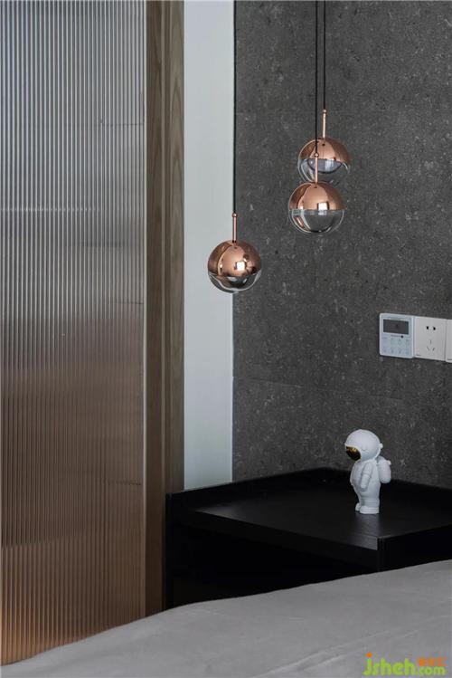 臥室連接內(nèi)外空間材質(zhì),點(diǎn)綴深色木質(zhì)加之石材顯得沉穩(wěn)充滿質(zhì)感