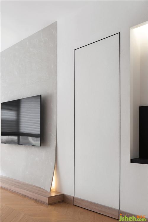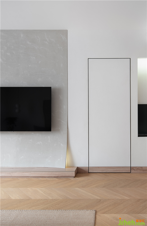 客廳背景用雙隱框暗門做法方便了次臥和休閑區(qū)的各自通行,也保留了背景的完整性。