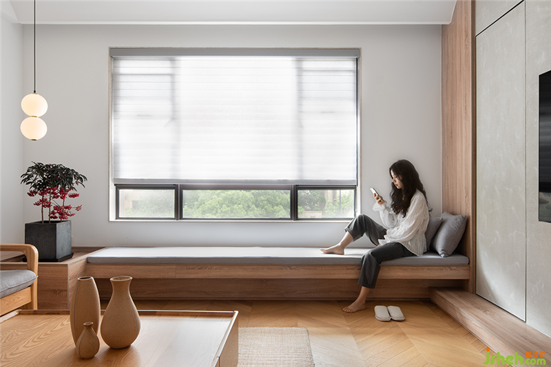 在愜意的午后,朝南窗戶光線延綿,女主人在窗榻下沐浴陽光的同時也體驗到了自由與舒適。