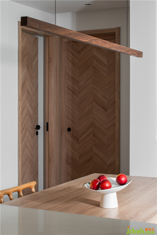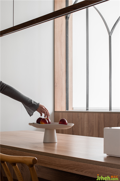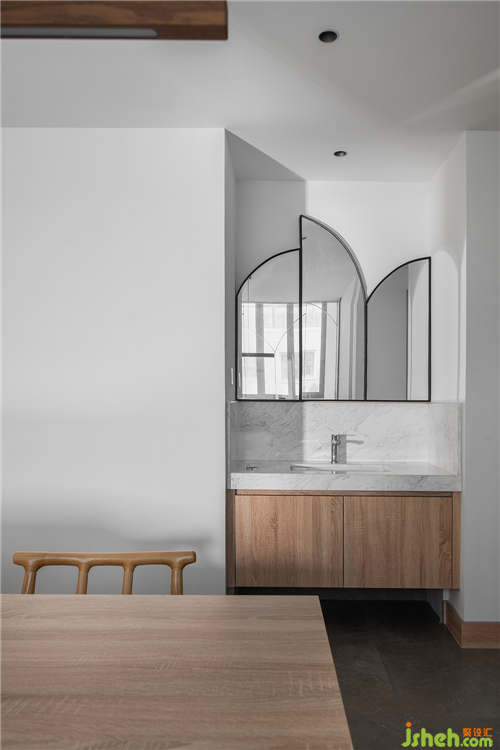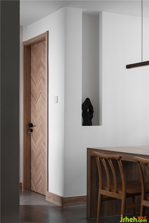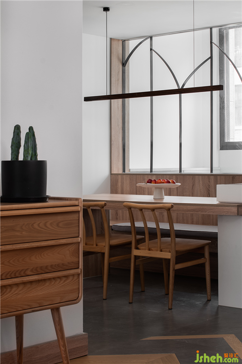 我們打破了原結(jié)構(gòu)設置,把餐廳區(qū)域規(guī)劃到過道一旁,舟山室內(nèi)設計師增加卡座形式的用餐體驗。