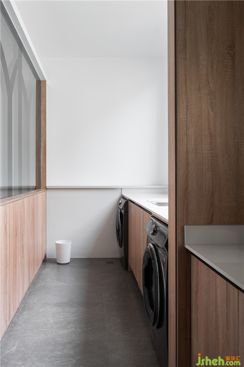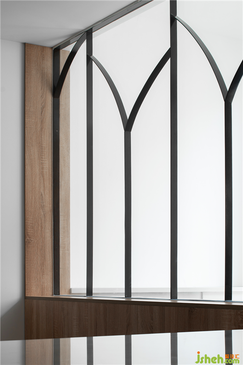 大面積的玻璃加之經(jīng)典弧度鐵藝造型將與廚房貫通的洗衣房空間的光線帶入餐廳,并在廊道上投下一抹安靜的陰影痕跡。