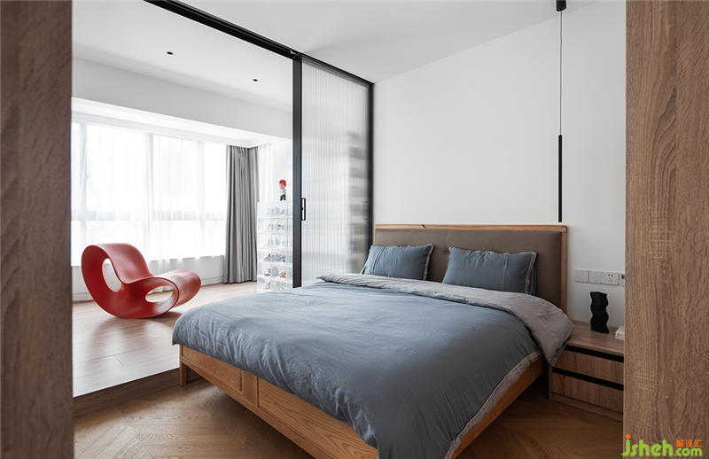 次臥營造了休閑和睡眠的兩個區(qū)域,它們從不同的方向進入,之間又運用了聯(lián)動移門,私密而又不失聯(lián)系。休閑區(qū)的大窗戶,讓陽光肆意灑滿房間。