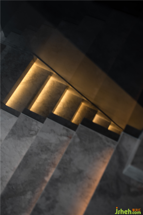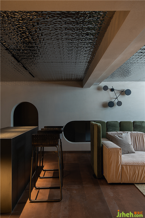 拾級而下的地下空間,由于層高的限制,空間頂面采用波紋鏡面質(zhì)感,解決了空間壓抑的缺點,模糊了空間的界限。