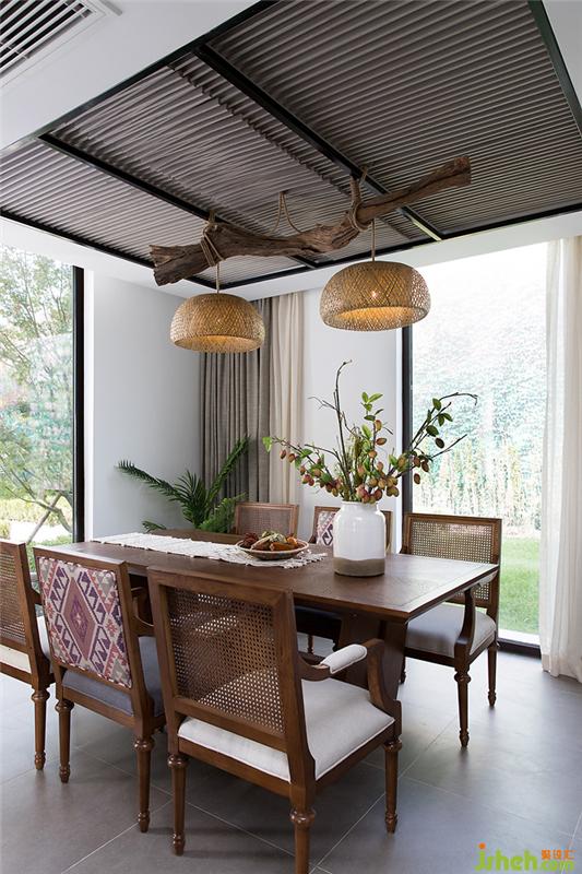 餐廳采用返璞歸真的風(fēng)格,采用仿真枯木元素與編織元素營造田園山野的輕松氛圍。但實(shí)木家具與精致的圖案又將奢美巧妙的結(jié)合起來。