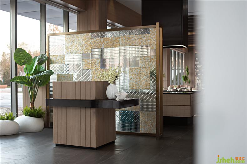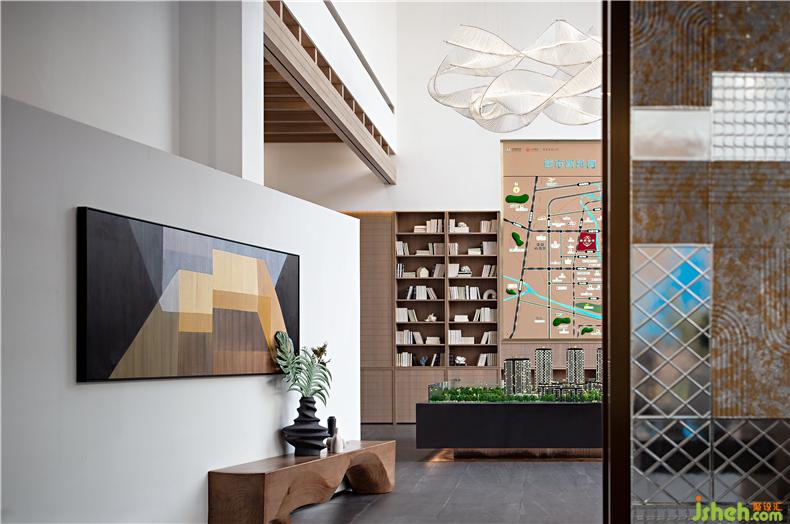 作為一個海邊城市,青島最大的特色便是遼闊的海岸線,徐徐海風吹動蔥綠的樹葉,在陽光下發(fā)出沙沙的響聲,白色海浪拍打黑色的礁石,金黃的沙灘印出一層又一層的線條。沙盤區(qū)的壁畫將這些具體事物抽象化,室內(nèi)設(shè)計師將自然元素以現(xiàn)代藝術(shù)的形式展現(xiàn)出來。