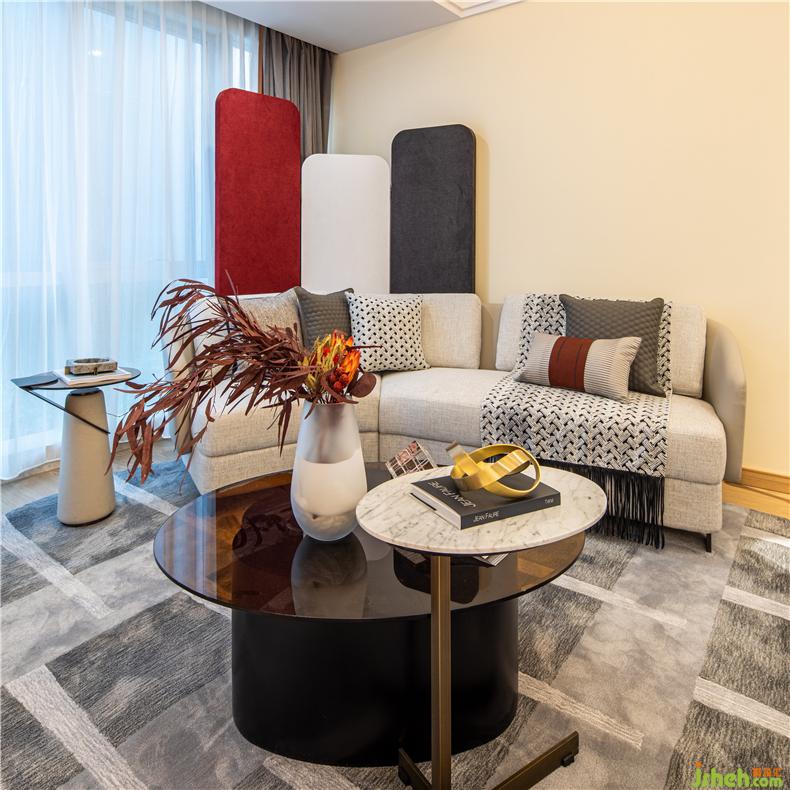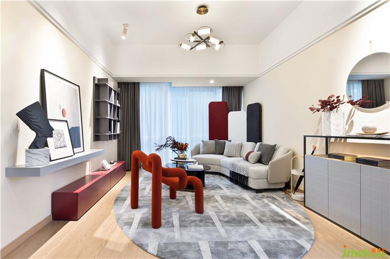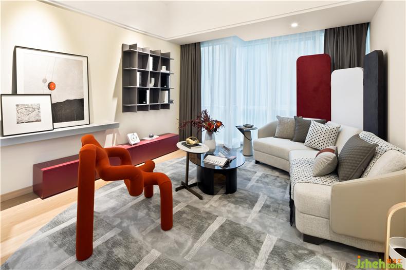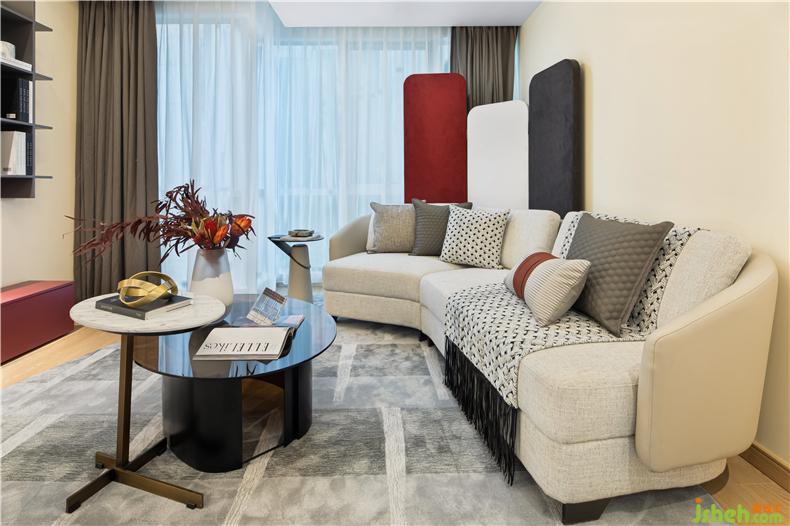 客廳采用的米白色的主色調(diào),配以木質(zhì)地板與拼接圖案的地毯,在現(xiàn)代風(fēng)格中又添加極具北歐特色的家居、點(diǎn)綴以大氣的經(jīng)典中國(guó)紅,將中式與法式完美地融入進(jìn)現(xiàn)代風(fēng)格中。室內(nèi)設(shè)計(jì)師