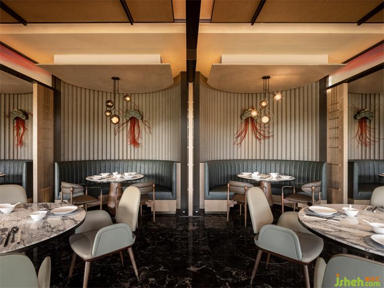 疏密有致的水紋藝術(shù)玻璃搭配漁網(wǎng)金屬的屏風(fēng),使空間更加現(xiàn)代和開放,貫穿自然流動(dòng)的形態(tài),薄霧的水域景致延續(xù)室內(nèi)空間布局。