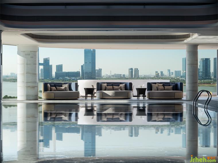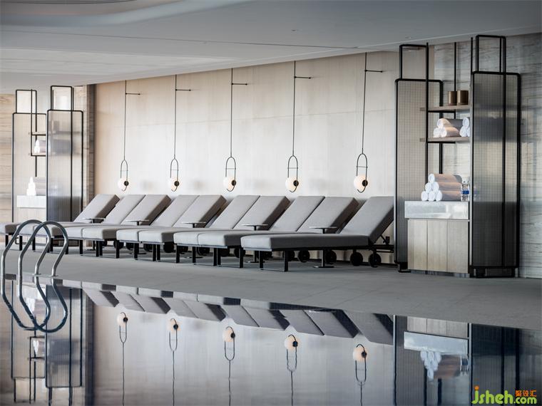 靈感源于南沙獨(dú)有的水田和濱海景觀,酒店室內(nèi)泳池,廣州南沙金茂萬豪酒店設(shè)計(jì)健身房和戶外休息平臺(tái)以水岸交界為概念,結(jié)合水田的形態(tài)打造天窗。將光與影收納于空間中,賦予空間延伸感。