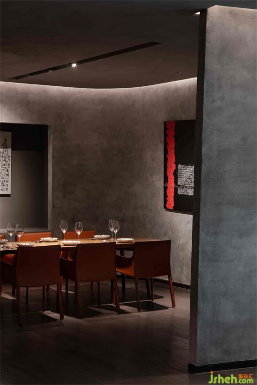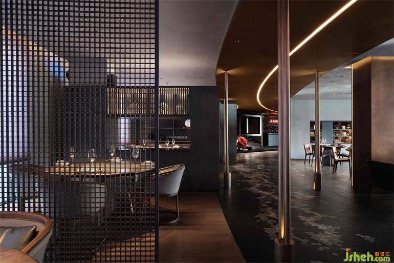中央吧臺區(qū),北京餐廳設(shè)計師用玻璃磚和藝術(shù)肌理漆縱橫阡陌,特殊材料所帶出強(qiáng)烈的風(fēng)格特色,粗礪與精致交錯,為空間的賦予豐富的可能性。