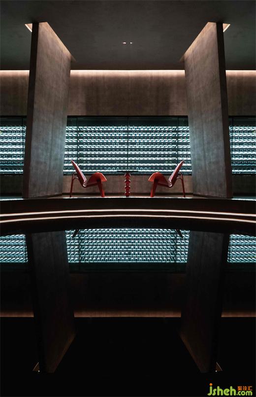 白天在自然光下兩種材質(zhì)呈現(xiàn)虛實之趣,晚間,中央吧臺琉璃磚由內(nèi)浸潤出溫暖靜謐的光。