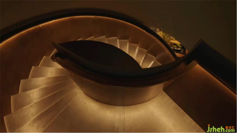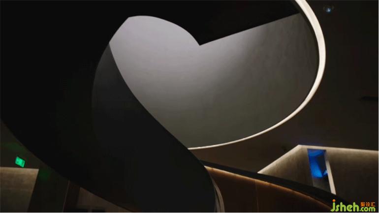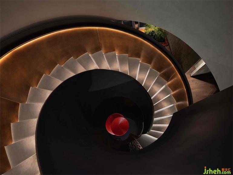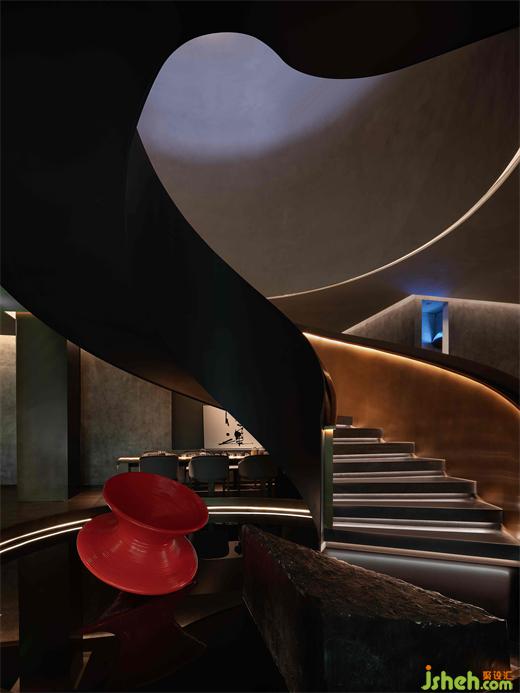 樓梯做了一個(gè)金屬旋轉(zhuǎn)的形式,扶搖而上,移步換景,北京餐廳設(shè)計(jì)連通一層空間。
