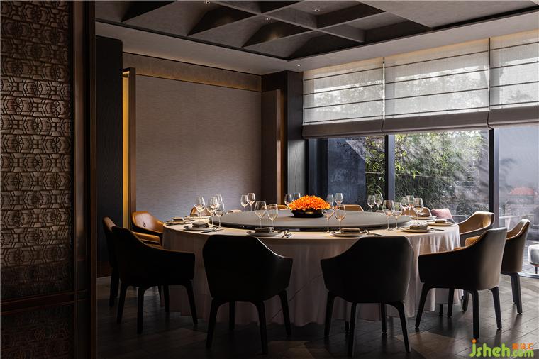 建筑在線條的使用方式上并不僅僅是展現(xiàn)線條的結(jié)合而產(chǎn)生的形式美感,更是要在形式中體現(xiàn)建筑的韻味。喜瑞餐廳設(shè)計從整體建筑的體塊結(jié)構(gòu)至空間的拆解組合,充分利用線條的韻律、節(jié)奏,能夠?qū)⒔ㄖ膬?nèi)在的信息通過,落地玻璃的處理傳達出來,讓每個包間都能在玻璃幕墻的范圍之內(nèi),弱化室內(nèi)與室外的邊界。