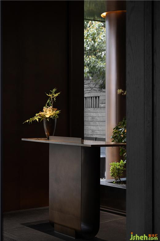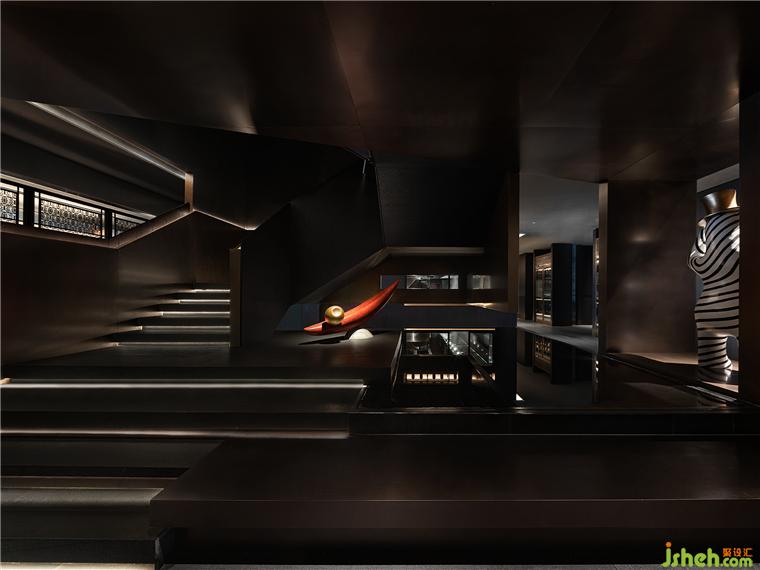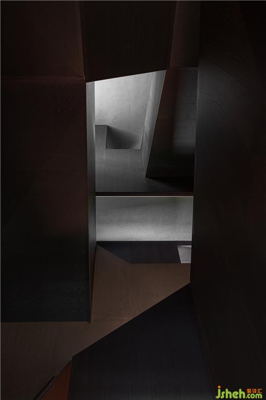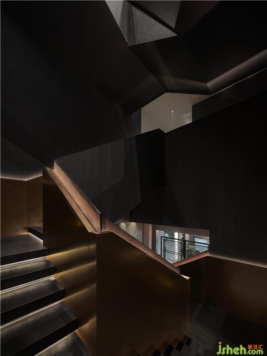 較為深沉的頁巖板吸收空間中餐廳漫反射的余光,以燭光的方式照亮用餐區(qū)域,在視覺上削弱了人們對于下層空間的關(guān)注,使目光聚焦在菜品本身,讓空間擁有一種無限延伸的視覺效果。